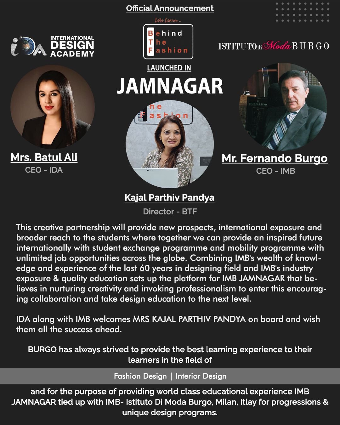 Combining IMB’s wealth of knowledge and experience of the last 6 years in designing field and IMB’s industry exposure & quality education sets up the platform for BTF Jamnagar that believes in nurturing creativity and invoking professionalism to enter this encouraging collaboration and take design education to the next level.